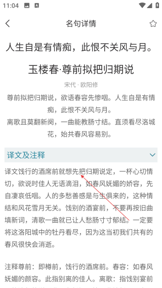 3、名句详情页浏览【译文及注释】等内容。