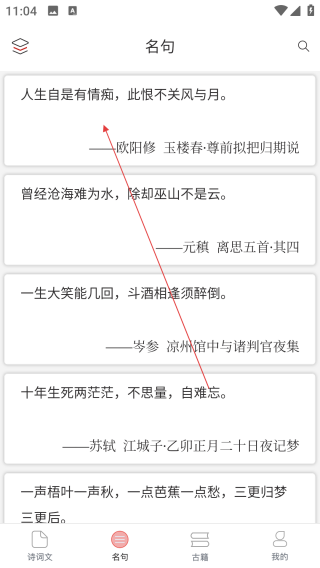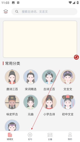 1、首页点【名句】进入名句浏览页。