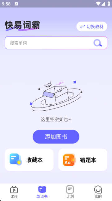 如图所示;直接来到【单词书】界面中。这里能为用户提供众多热门推荐和核心功能入口;点击右上角可以切换教程,点击【添加图书】可以新增其他的单词书。