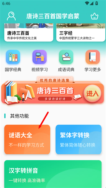 1、打开唐诗三百首全集APP,点击首页的“谜语大全”。
