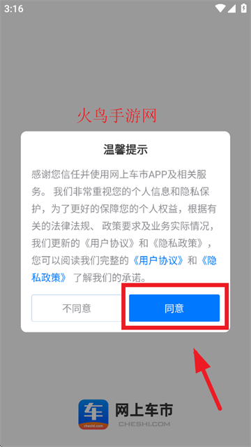 下载安装并打开网上车市app,在温馨提示界面点击同意