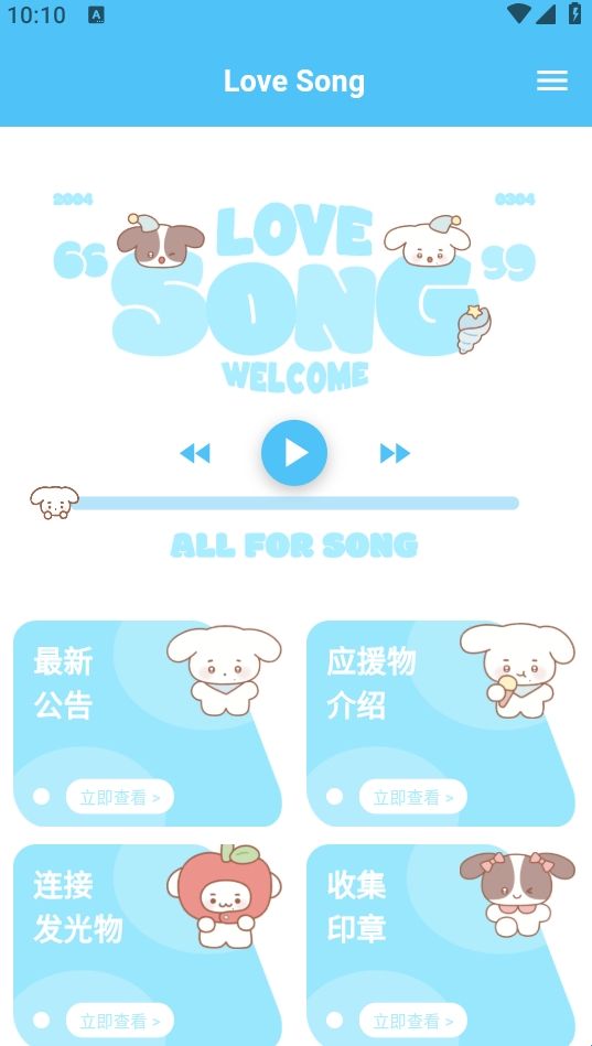 宋亚轩后援会软件下载(LoveSong)是一款时代少年团宋亚轩后援会打造的一款专属于宋亚轩粉丝的软件客户端。这款软件中会发布最新关于宋亚轩的公告,还有宋亚轩应援物的介绍和链接,粉丝还可以收集印章来玩,后续还会有专属空间等功能,喜欢宋亚轩的朋友不要错过了。