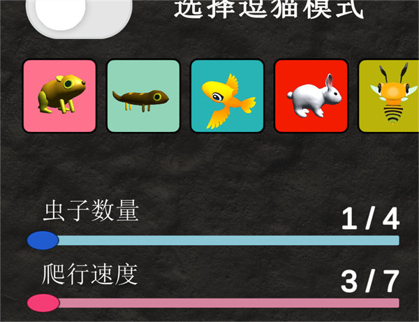 在逗猫游戏当中拥有多种模式可以选择例如老鼠、鱼、蝴蝶、蜘蛛、蜜蜂、鸭子等玩家还可以调节数量和速度