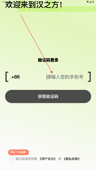 2、验证码登录页,输入手机号,勾选协议,点获取验证码。