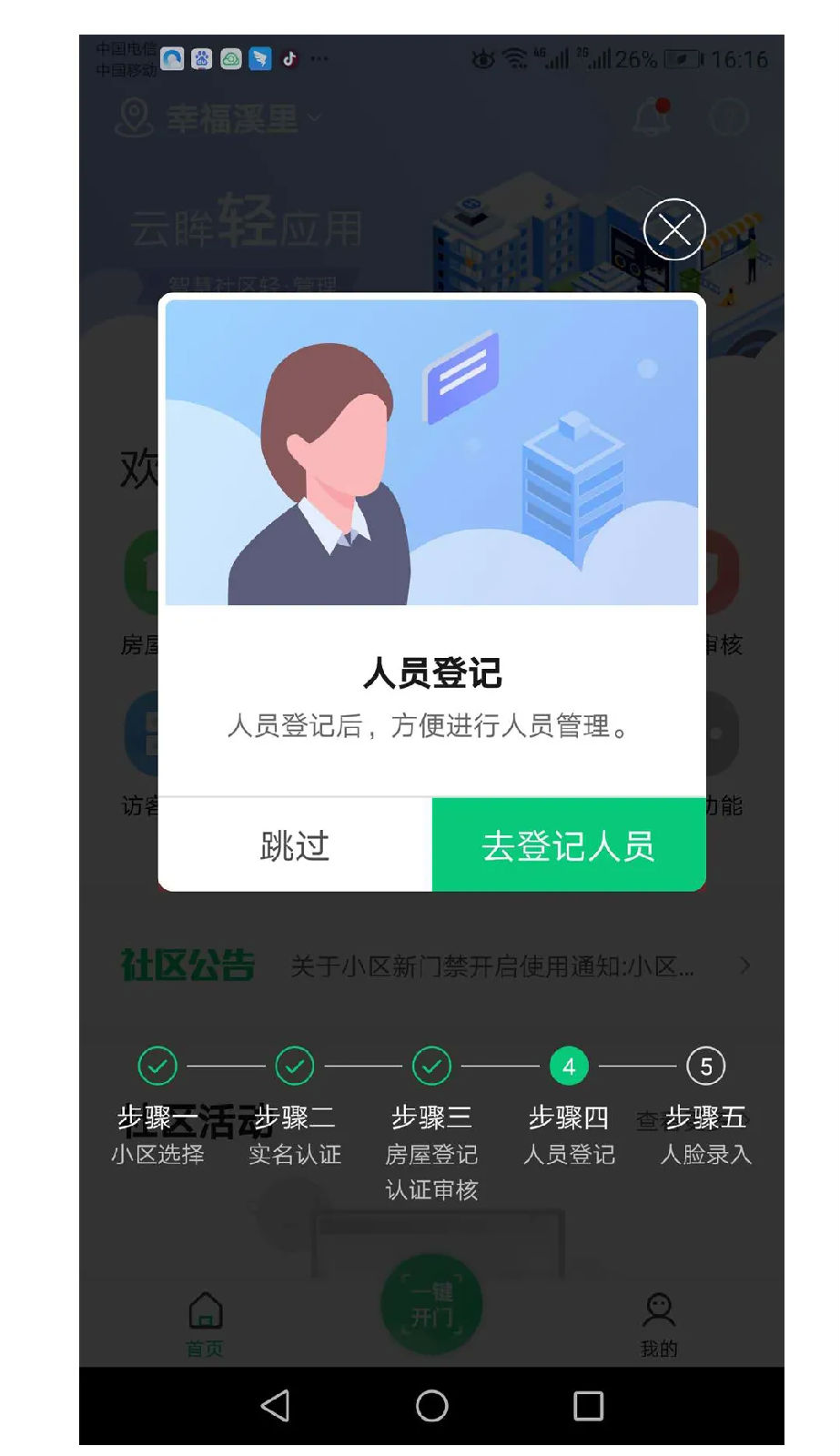 步骤四:家庭成员(或租客)登记操作,登记并采集人脸成功后,被添加的人员可以不需要再次在其手机上操作注册即可刷脸进出小区(此步骤主要是添加家中的老人、小孩等没有智能手机的家庭成员)。有智能手机的家庭成员也可以在其自己手机上注册,注册后由业主审核通过即可。