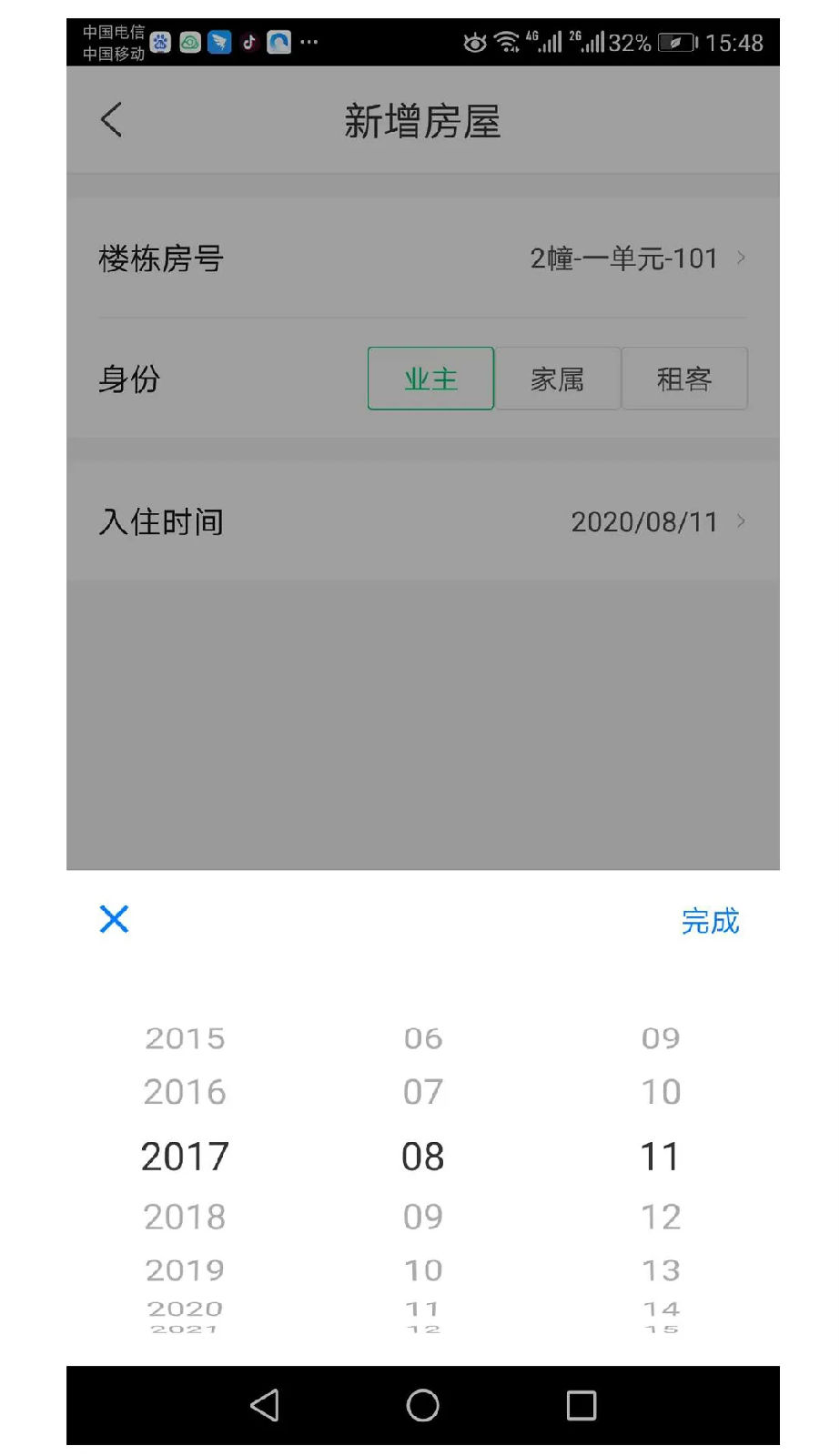 选择您所居住的楼栋、单元、房号,填写好入住时间后提交等待物业审核