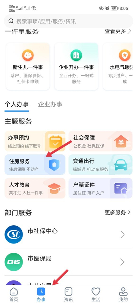1、进入到软件之后在办事栏中点击住房服务。