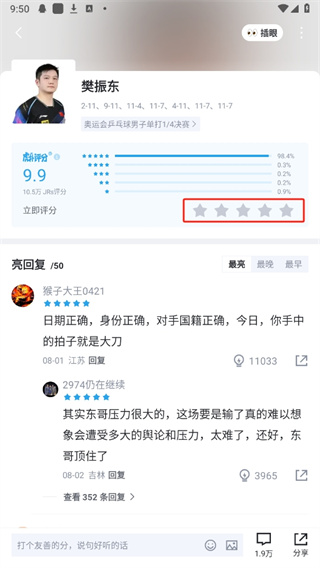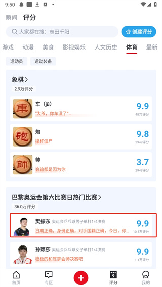 你可以在篮球、足球、电竞、F1、格斗、橄榄球等全球顶级赛事评分中留下你的评价,找到和你共同关注一场比赛的纯正体育迷,和他们一起分享你对比赛的热爱和见解,释放观赛后澎湃的激情。
