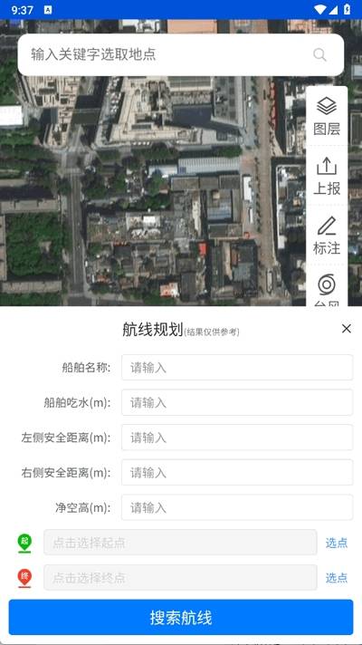 智能航线规划:输入起点/终点,自动生成适配船舶参数的安全航线,标注左侧/右侧安全距离。