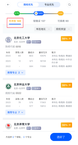 值得注意的是,本功能具备人性化调整空间。一方面,你可以在页面顶部选择切换院校优先/专业优先的模式,分别适配更在意学校/有明确专业兴趣趋向的考生;另一方面,你可以拖动界面上方的分数线条,为自己设置更适合自己的「冲、稳、保」分数段。