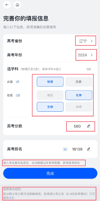 在此功能的上方,点击编辑按钮,你可以先将自己的「地区、选科、考分」等信息填入系统;以下三点值得注意一下: