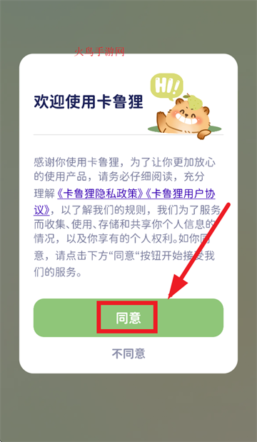 下载安装并打开卡鲁狸app,在欢迎使用卡鲁狸界面点击同意