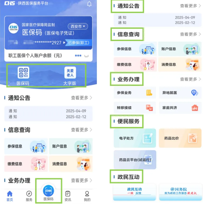 当用户打开陕西医保APP首页,映入眼帘的依次是:参保状态显示、医保码展码按钮、老年人适用的“大字版”。往下依次是“通知公告”、“信息查询”、“业务办理”、“便民服务”、“政民互动”五大模块,共包含29项线上办理业务。