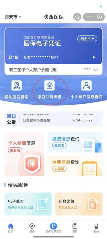 用户点击底部“服务”模块,进入“服务”模块后选择家庭共济绑定查询,即可查询到该账户的绑定信息。