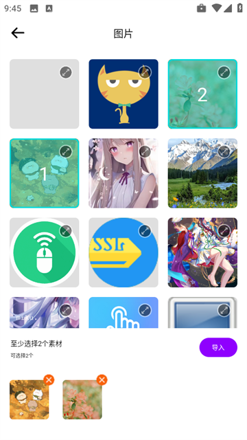 5、至少需要选择两个素材,点击“导入”。
