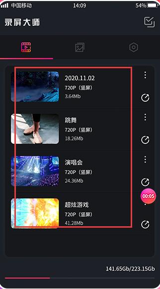 1、录制视频列表,展示了已录制视频的名称、分辨率720P竖屏、文件大小等信息,方便用户管理已录视频。