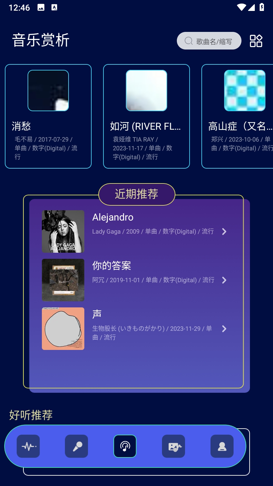 3、音乐赏析:近期推荐,火热上线。