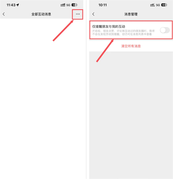 步骤:我 - 朋友圈 - 我的朋友圈 - 消息队列 - 消息管理。