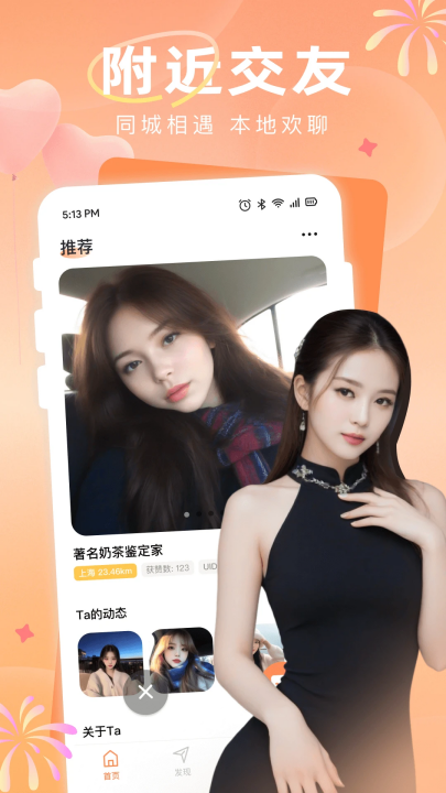 1、附近交友:发现附近优质的TA,搭讪秒回复。