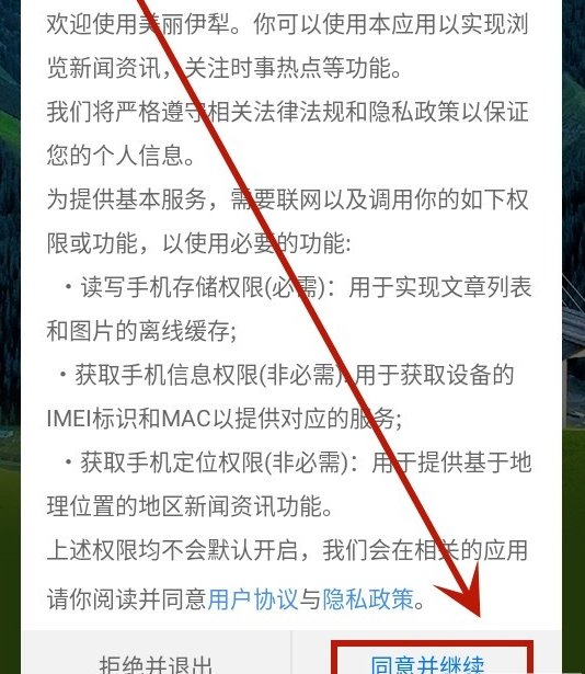 1.下载安装并打开美丽伊犁app,点击同意并继续,同意隐私政策