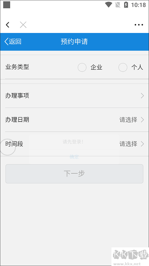 4、接着在预约申请当中填好业务类型、办理事项、时间段后点击下一步;