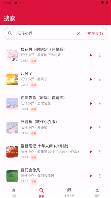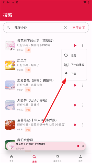 3、输入自己喜欢的歌名或者是歌手,我们以”旺仔小乔“为例