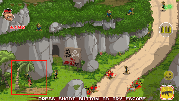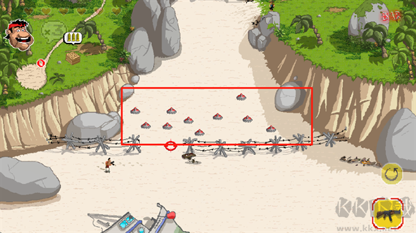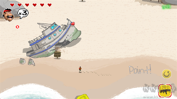 2、玩家被大海冲上沙滩,通过点击屏幕右侧的“枪械”开火和“圆形按钮”翻滚,通过长按屏幕也可以做到“按住哪里打哪里”的效果,角色血条和命数都在屏幕左上角可见。