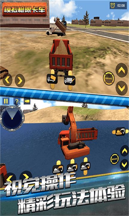 3、车辆操控:操控各类施工卡车,运用转向刹车油门等基础操作,配合车辆专属功能完成作业任务。