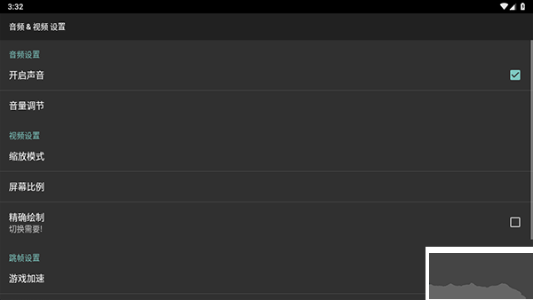 3、在音频设置里可以设置声音、帧率和加速等等