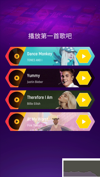 2、拥有超过30首横跨流行与电子的高质量曲库,且内容持续更新,你可以上传自己喜欢的本地音乐,系统会自动为其生成专属的弹跳关卡 ;