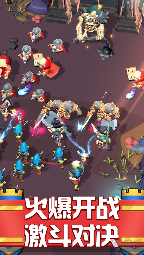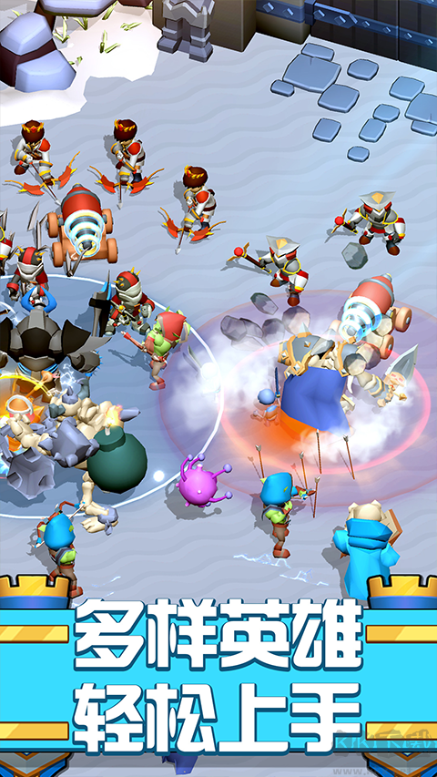 3、自动战斗:敌我双方士兵按站位自动对攻,前排肉搏后排射击,玩家可手动释放统帅技能例如全体回血或敌方眩晕。