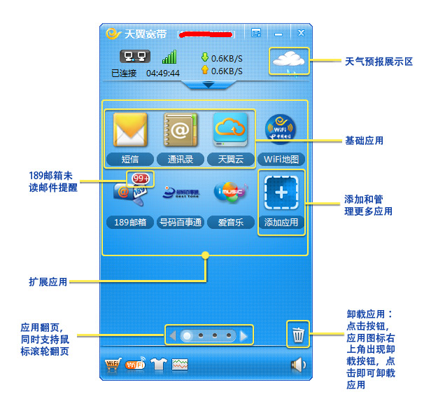 5.更多免费增值服务尽在天翼宽带客户端,例如:天翼视讯、网上营业厅、189邮箱、院线通、天气预报等等。