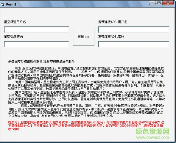 使用电信的朋友们都知道,为了防止多用户共享上网,电信采取了星空极速拨号,就是把原ADSL账号密码进行加密,而后用星空极速客户端进行拨号,从而防止大家用路由。不过这个根本不能防止什么,呵呵,这个不用多说,软件一大把,不过我要给大家推荐的这个软件超简单只要你会打字你就会 !!
