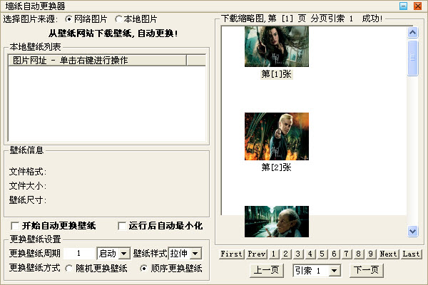壁纸自动更换器是一款绿色小巧的桌面壁纸定时更换工具。软件可以每天换一张,保持新鲜感;还可以每秒换一张,让你过足看图瘾...就看你的网络够不够快哦。本程序为绿色程序,可以任意复制,不用安装,可直接运行。