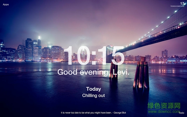 Momentum能给老掉牙的Chrome新标签页换个样式,首先添加一个漂亮的风景照,右上角显示当前城市天气,右下角可添加待办事项 Todo 列表,正中间显示系统时间以及今天的主要目标,想切换回原标签页,点击左上角 Apps 即可。