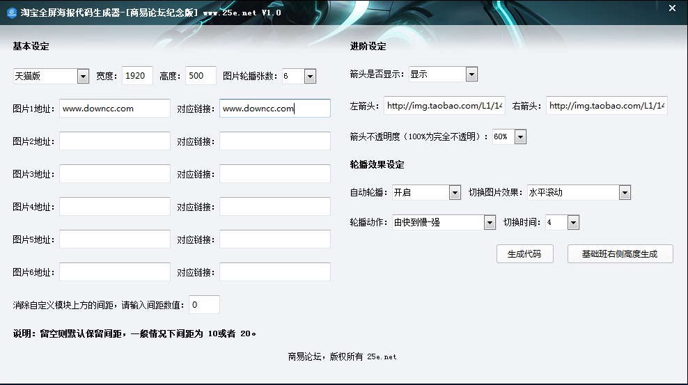 淘宝全屏海报代码生成器是专业的淘宝美工们一定都需要一款快捷方便的美工工具,它能帮助您快捷高效的完成网店设计,具有全屏海报轮播、全屏单张海报、全屏背景固定、客服模板生成、旺旺代码生成、特效模板生成等功能。