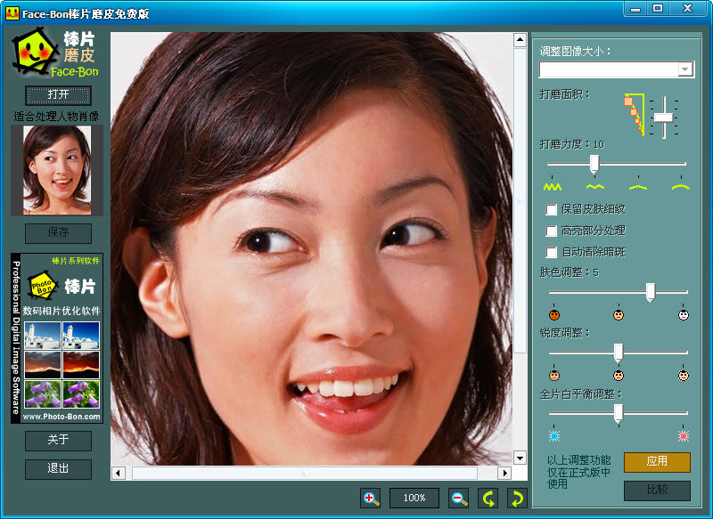 “Face-Bon棒片磨皮”对于因为图像失真压缩而在人物皮肤上产生的色块现象也能够很好的解决,通过进行光滑打磨处理,使图像里人物的皮肤恢复细致平滑。让个人相片也可以通过电脑处理,实现封面女郎效果。点击1、2次鼠标就能完成复杂的人像照片“磨皮”处理操作让数码照片中人像的皮肤变得光滑、细致,去除肤色的不均匀、皱纹和暗斑,使人像照片的处理过程充满乐趣皮肤颜色调整功能,即时呈现白皙皮肤或健康古铜肤色,满足不同用户的审美需求先进的优化技术对人像皮肤自动识别、整体分析、智能优化,优化效果明显适用于很多情况下的人像处理,使人像主体更加漂亮、年轻人像白平衡纠正、虚化锐化调节功能,可以使人像照片呈现出不同的艺术效果。