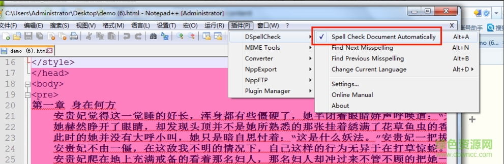 6.首先我们需要在图中找到【插件】选项,然后选择DSpellCheck并将Spell Check Document Automatically选项前的对钩去掉。