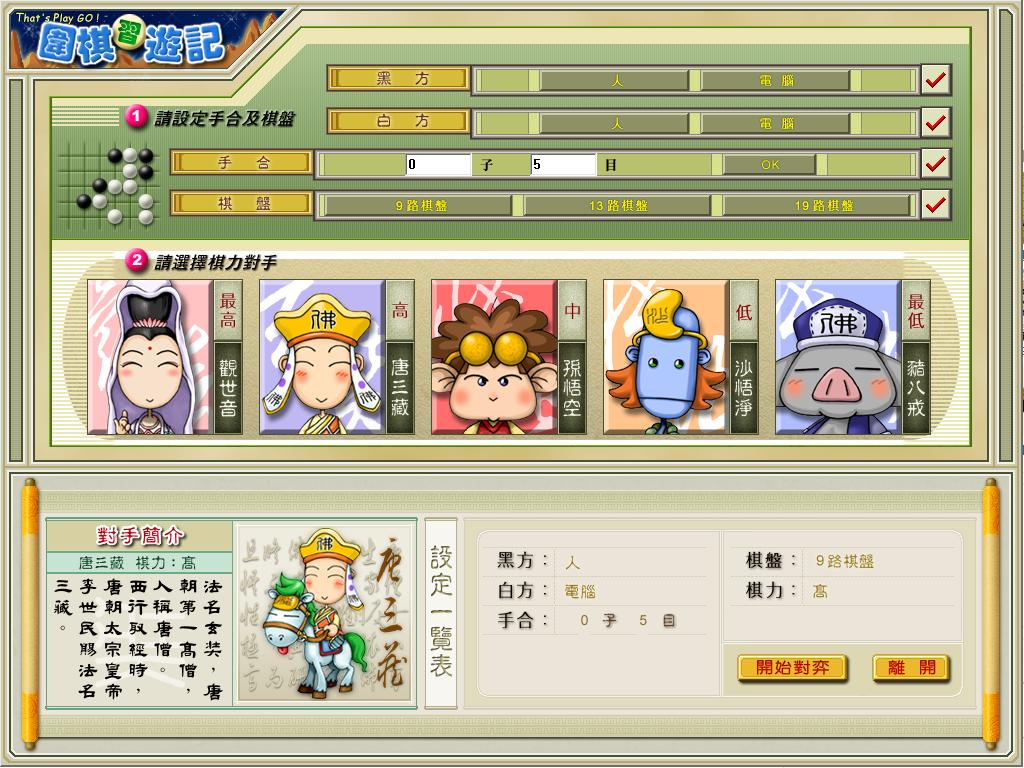 唐三藏完成取经任务后,因沿途收服许多活泼可爱的小妖,为让这些小妖修成正果,终在众多经书中,挑出棋经一书,以动画方式教导小妖,使其“长智慧生灵性”,完全去除魔性。 围棋入门软件,从围棋的起源,围棋的规则开始,典型示例讲解围棋的基本手段,布局理论,中盘技巧。
