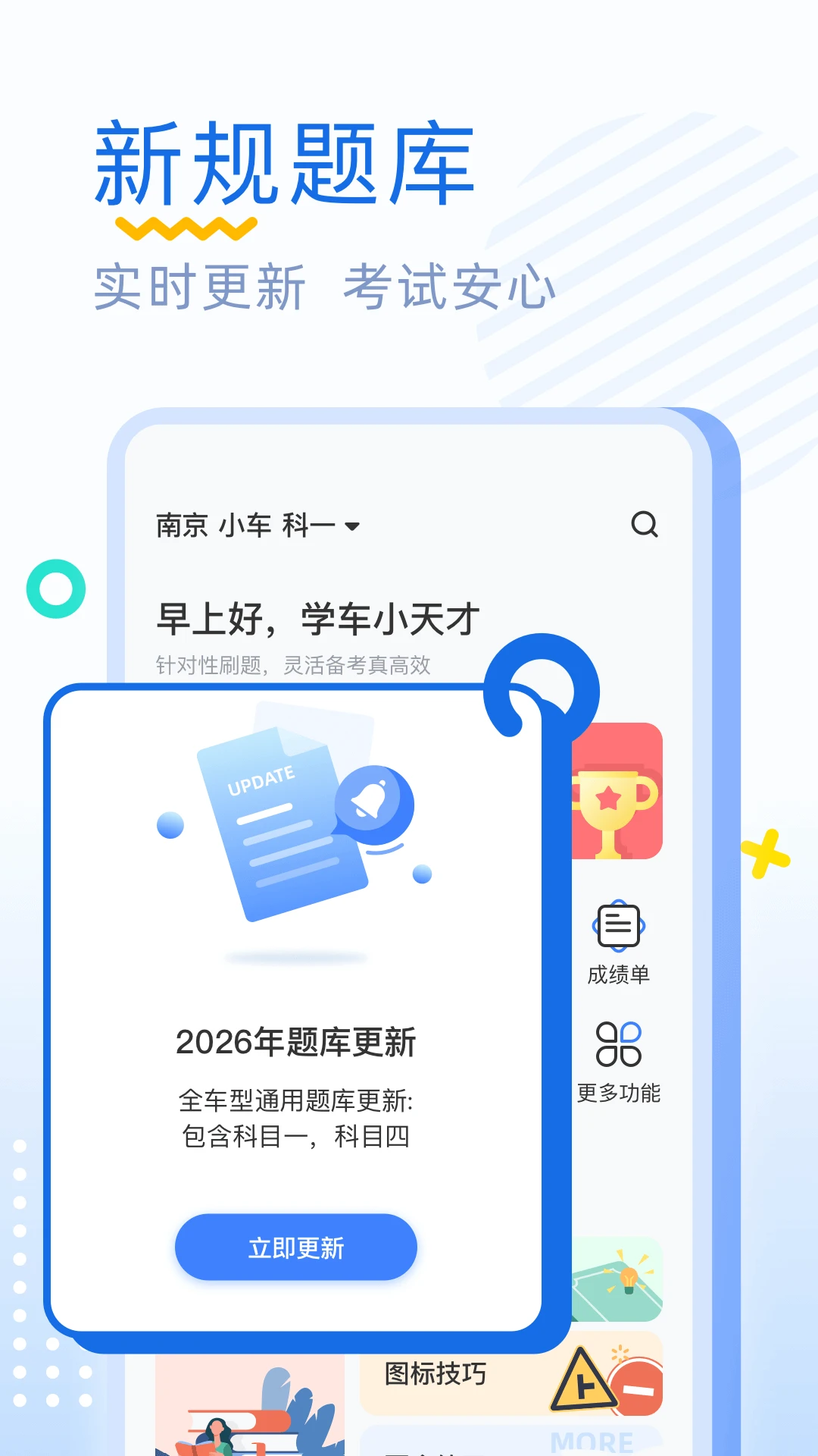 1、全新题库:采用2026新版学车标准,涵盖完整的小车、货车、客车、摩托车题库,每周更新,每题都有解释;
