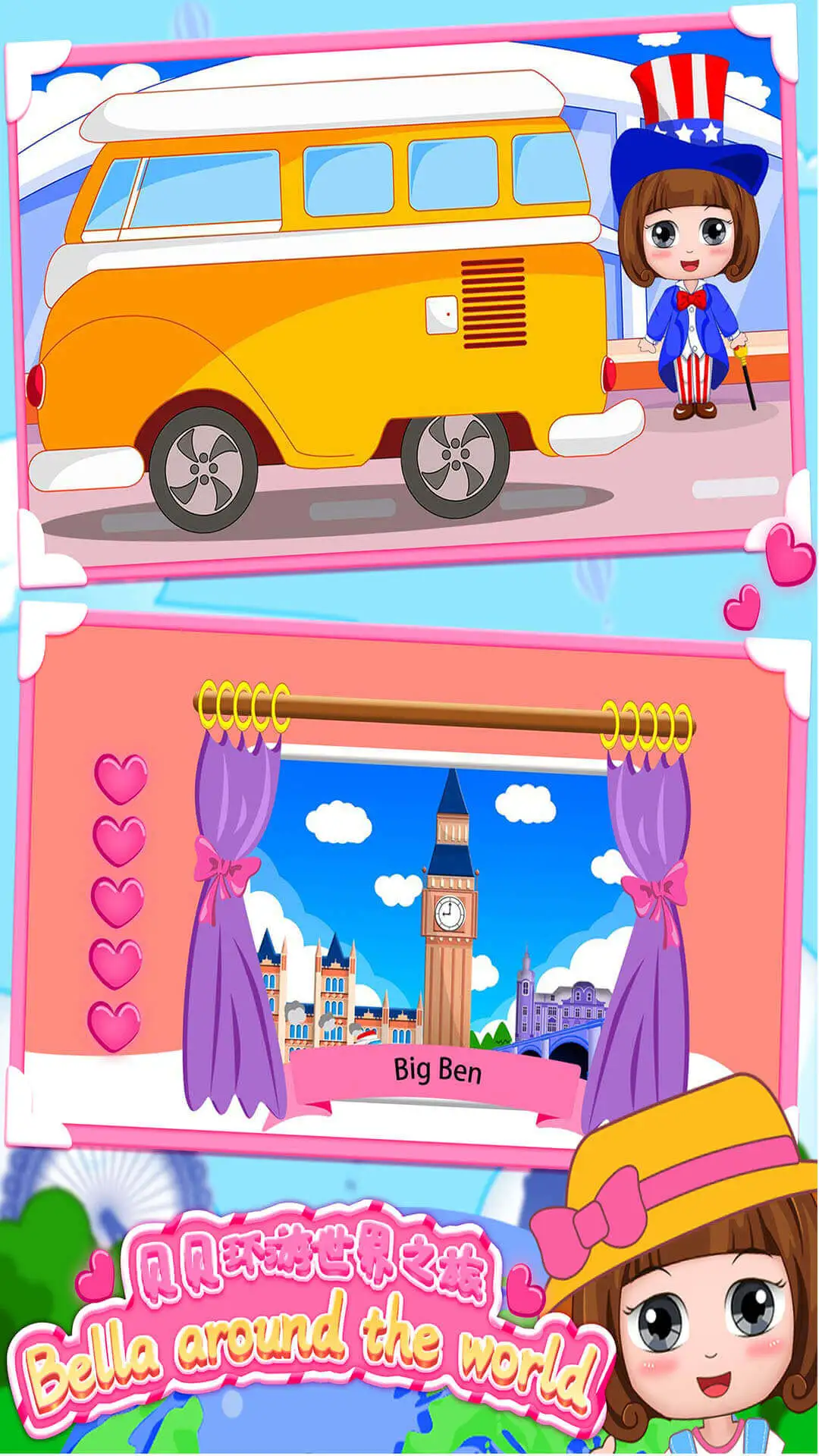 7、穿衣打扮——模拟“过家家”中的穿搭小环节。每到一个国家,小朋友都可以自由选择衣服搭配和头发造型,有好看的古装,漂亮的裙子,美丽的婚纱等等,供小宝宝们自由穿衣换装,尽情装扮打扮!圆小女孩们一个小公主梦想的同时,也可以让小朋友了解历史。