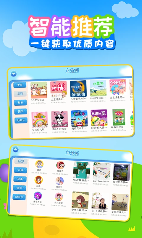 经典儿歌、英文启蒙、热门精品动画、诗词国学、成语故事、睡前故事全都有!
