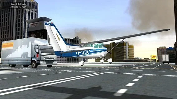 This is without a doubt, the most graphically advanced flight simulator in the app store. Weeks after flying you'll notice meticulous graphical details for the first time. Tires smoke as the plane hits the ground, aircraft metal deforms in a crash, the Bellagio fountains spring to life, sun glare blinds your view, and more.