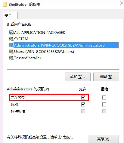 3、为ShellFolder添加完全控制权限,以便后续步骤能够修改成功
