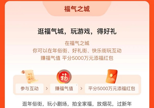 4、福气之城:在这里你可以在年俗街、好礼街、快乐街上去进行互动,赚取各种福气值,也可以参与到平分5000万的添福红包。