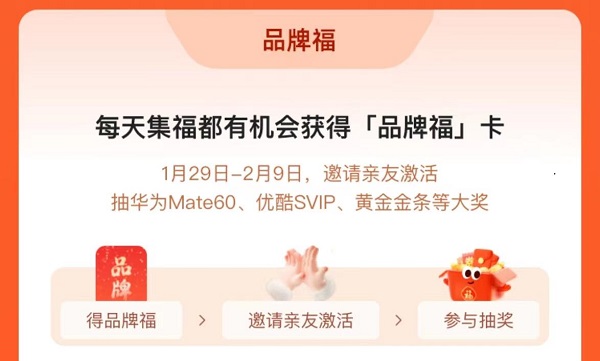 2、品牌福卡:想要参与抽奖的话,还有各种品牌福卡,可以参与抽奖,邀请好友帮助我们激活,就可以参与抽奖,可以获得华为mate60还有金条大奖,可以说是十分诱人的。