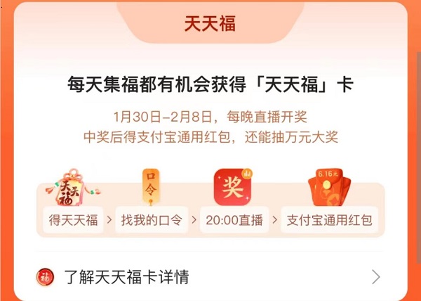 1、天天福卡:除了集五福瓜分奖金之外,还有其他的活动也可以参与获得奖励,比如天天福卡开奖,有机会获得万元大奖,还有各种支付宝通用红包,在使用支付宝付钱的时候就可以直接抵扣,十分方便。