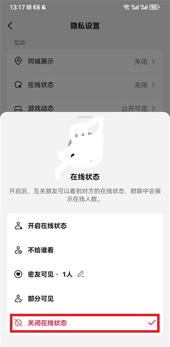 5、在下方出现弹窗之后,需要选择其中的【关闭在线状态】这样就可以让自己隐身在线,别人就看不到自己抖音在线了。