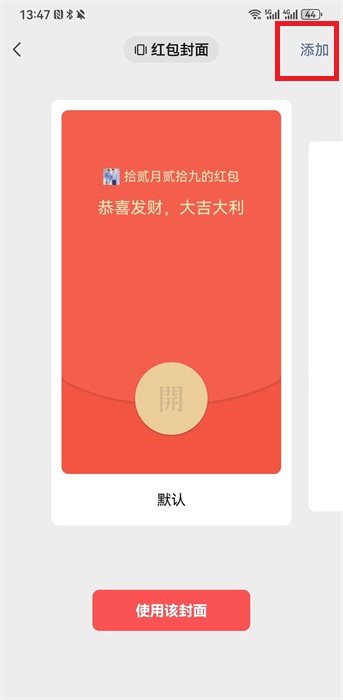 5、在红包封面界面之中,需要点击右上角的【添加】去进行添加;