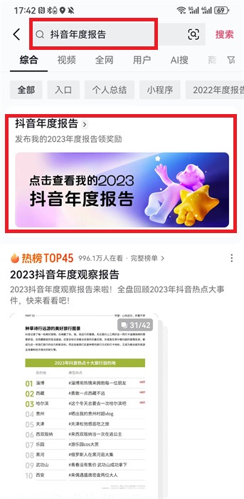 1、打开我们的抖音软件,在软件中直接搜索【年度报告】,在搜索的结果中点击【查看我的2023抖音年度报告】的海报,就可以进入到活动之中;
